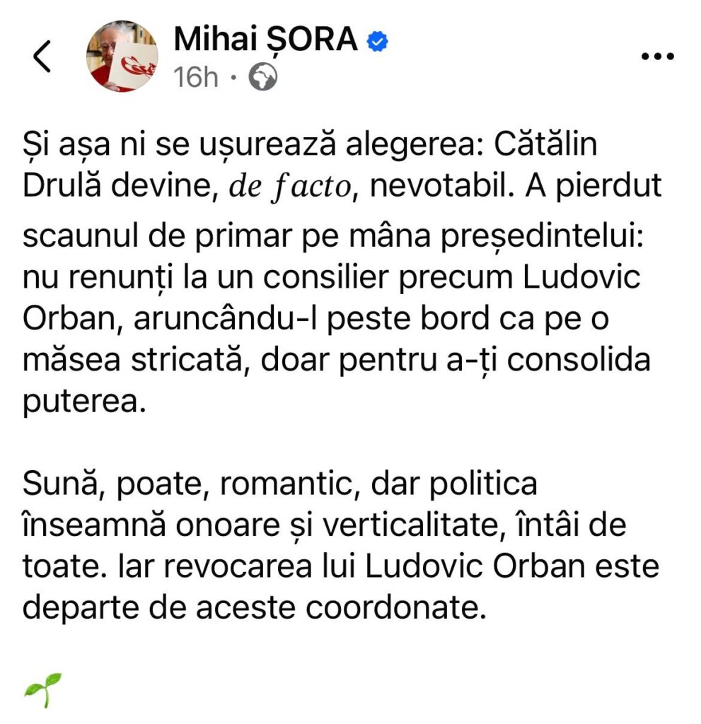 „Și așa ni se ușurează alegerea: Cătălin Drulă devine, de facto, nevotabil. A pierdut scaunul de primar pe mâna președintelui: nu renunți la un consilier precum Ludovic Orban, aruncându-l peste bord ca pe o măsea stricată, doar pentru a-ți consolida puterea.
